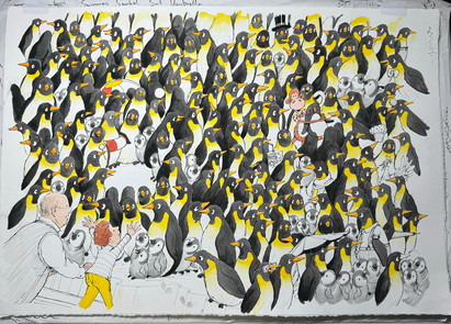 I’ve had two books released over the last few months, CLANG - the second title in my new quartet, following ZOOM which came out last year – and Adventures with Grandad, a bind-up of my Seasons’ quartet and a celebration of 10 years publishing these stories about Boy and Grandad. Clang! is about a Boy and his Grandfather on a hunt for Boy’s lost toy, which takes them all around the world. I’d love to tell you about how I make my books. It's quite a long winded and messy process — I don’t use a computer at all — it’s all pencils, gouache paints, and Indian ink, and piles and piles of paper.